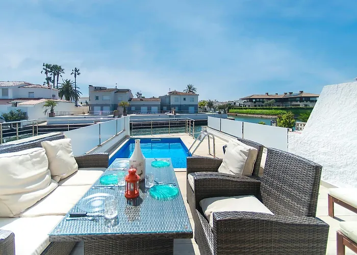 De 2-slaapkamer Welcs Casa 242 Emp Con Terraza Y Acceso Al Muelle Villa Empuriabrava beschikt over een terras op de rivier en een zwembad.